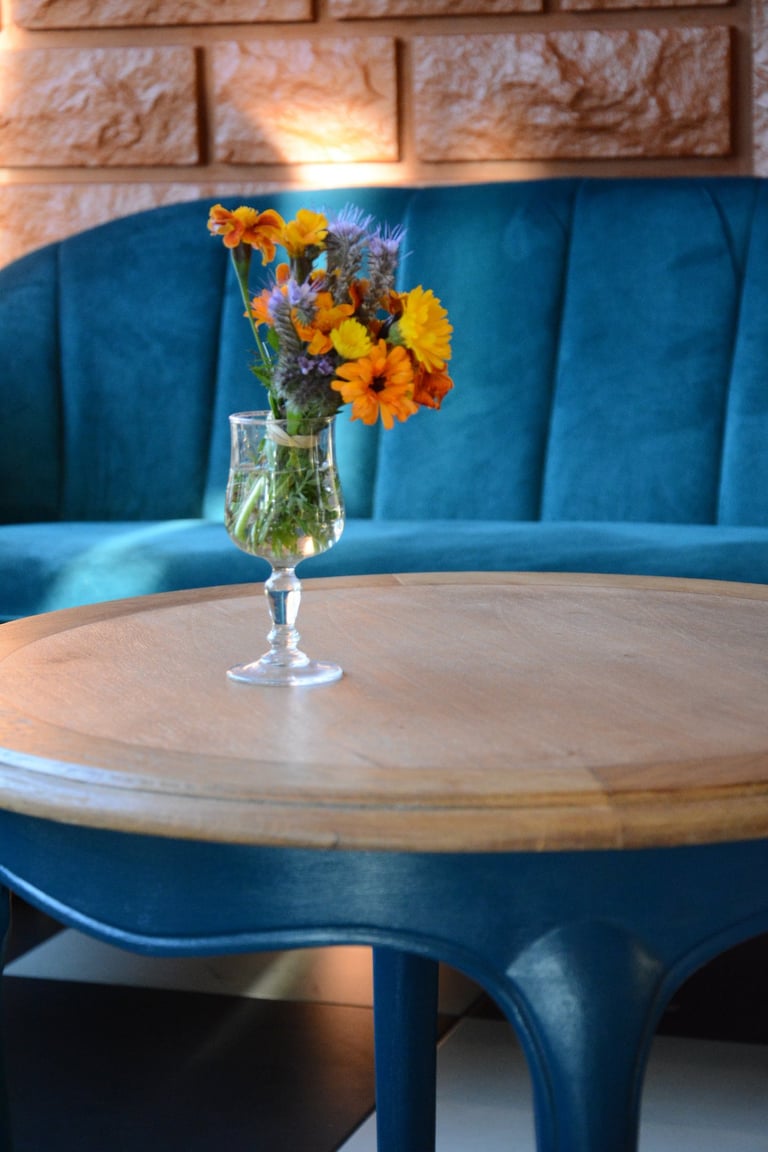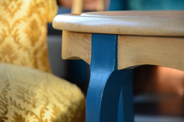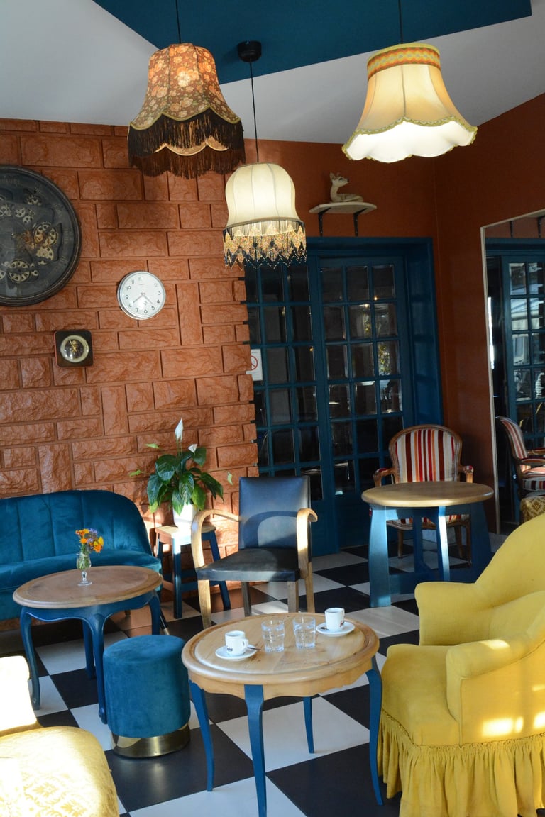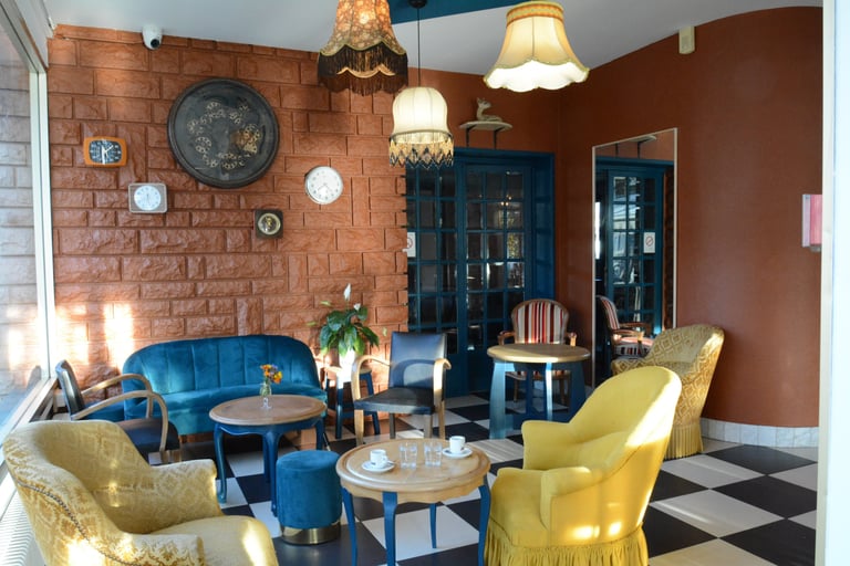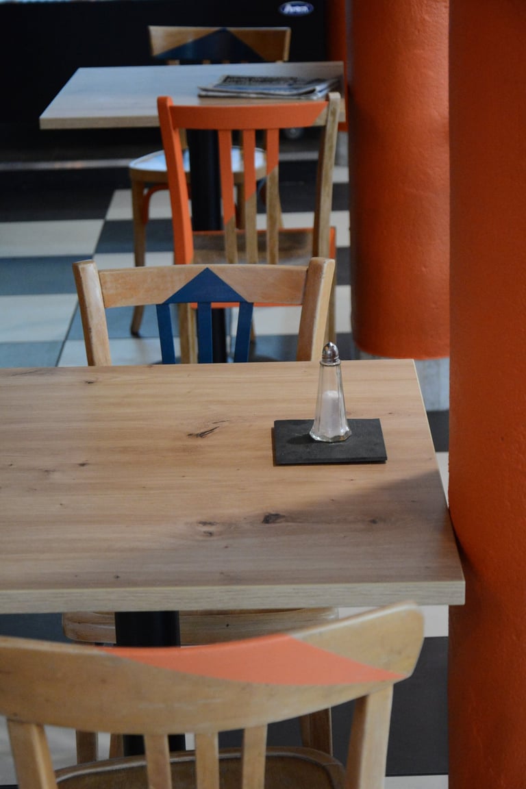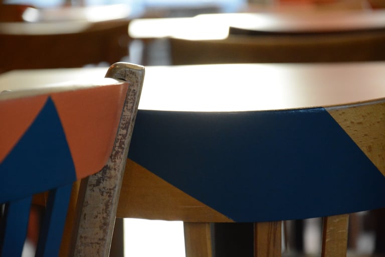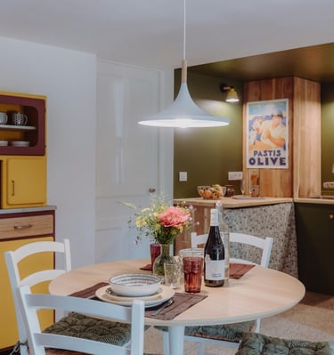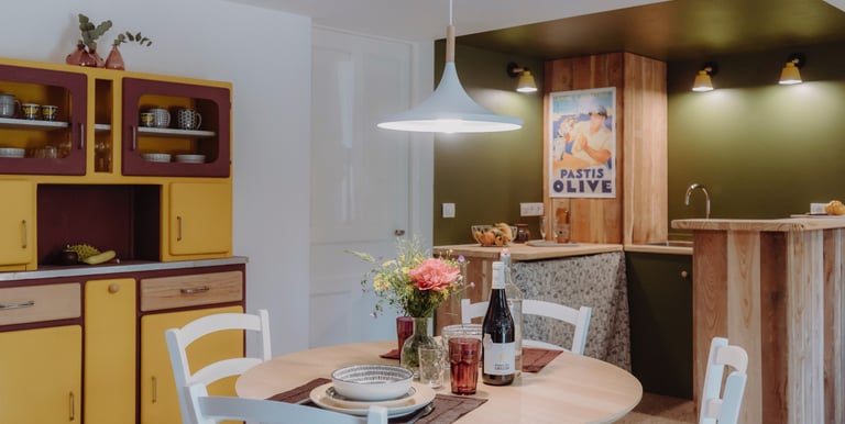 Mobilier entièrement repensé: tables bistrot et chaises chinées relookées pour l'originalité et la praticité.