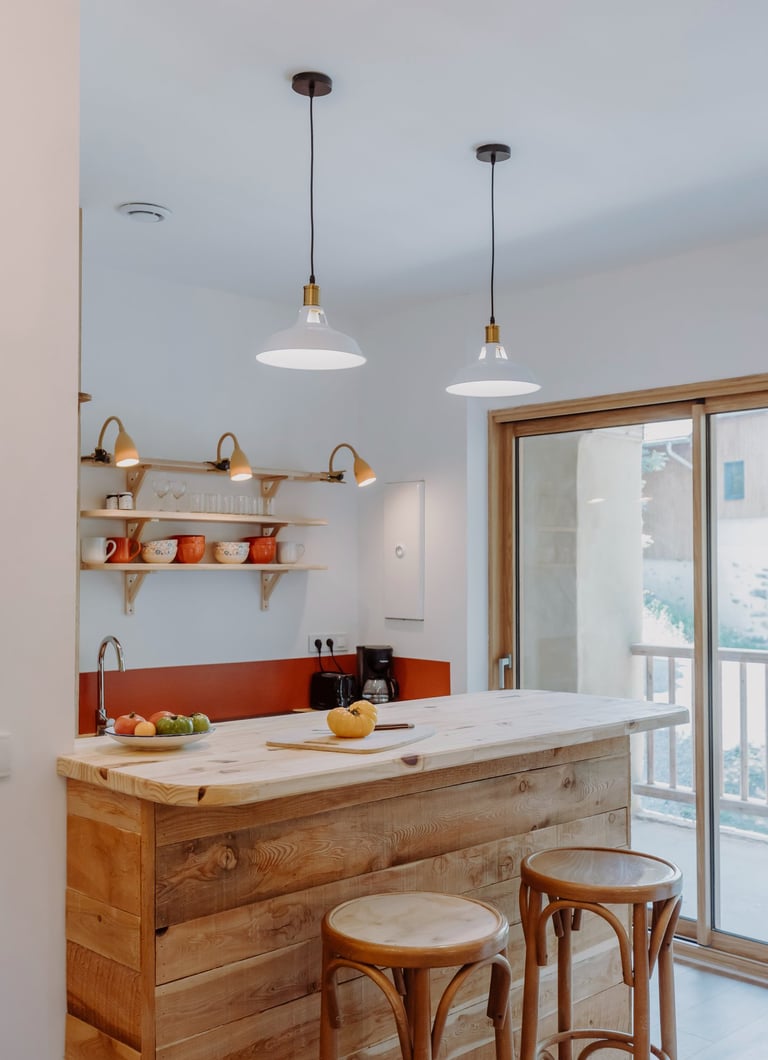 Point focal visuel: Comptoir et casquette du bar recouverts de bois pour la chaleur.