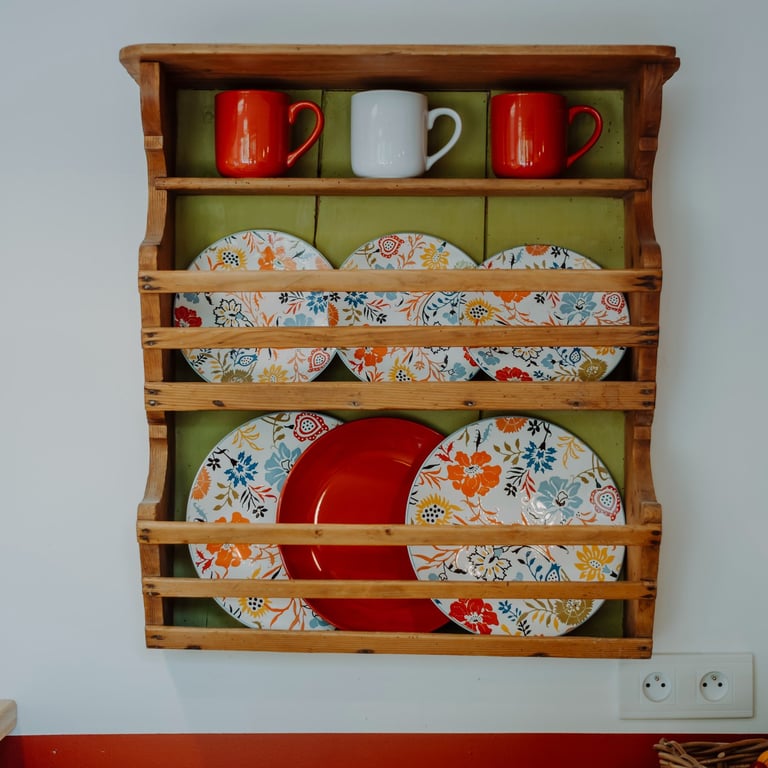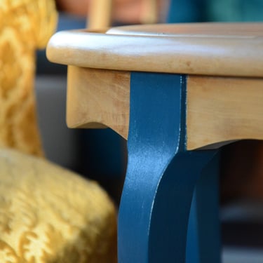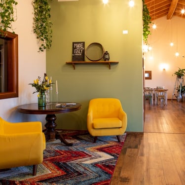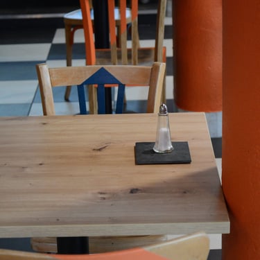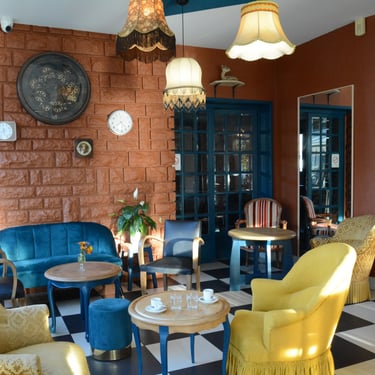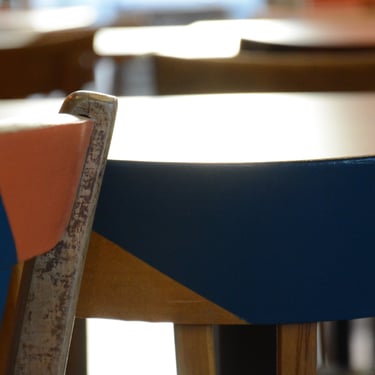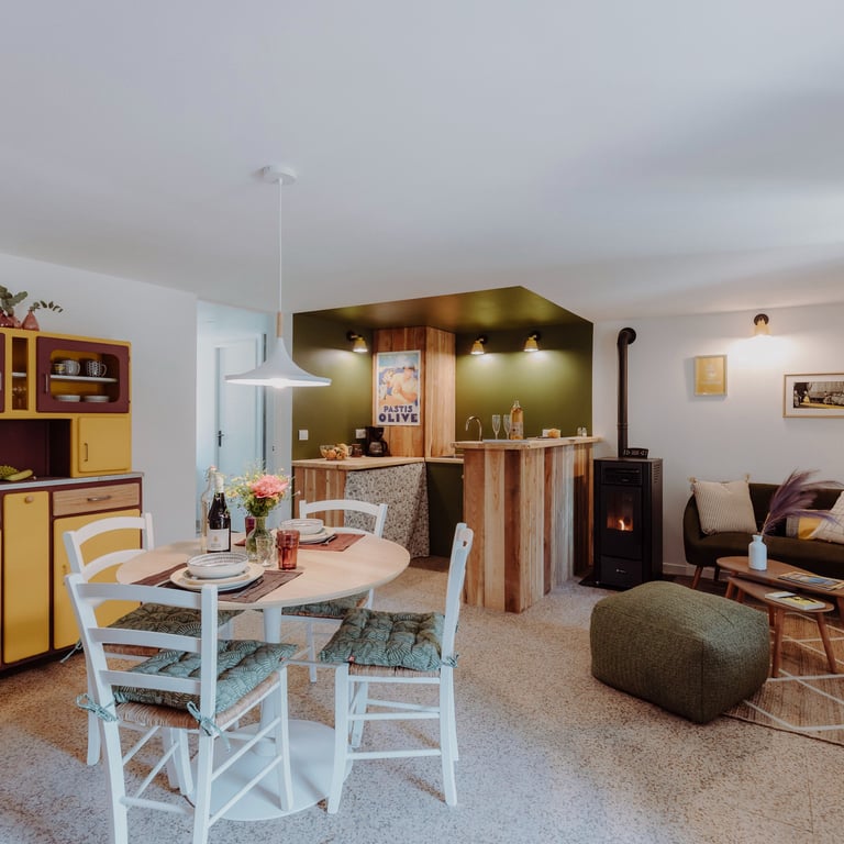 Mobilier entièrement repensé: tables bistrot et chaises chinées relookées pour l'originalité et la praticité.